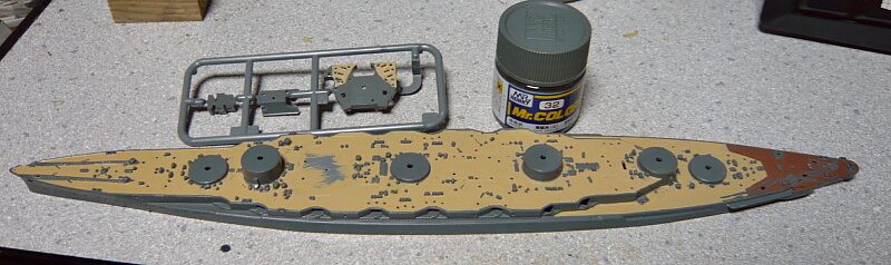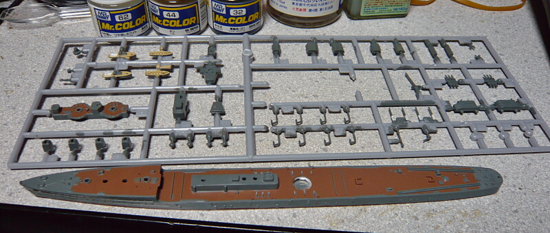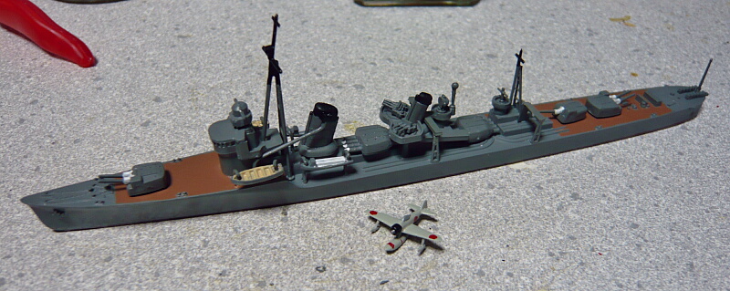 軍艦色2を基本にやタン、つや消し白などで各所を塗ったところ。艦底色も塗ってあります。
