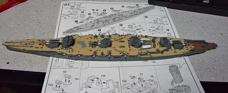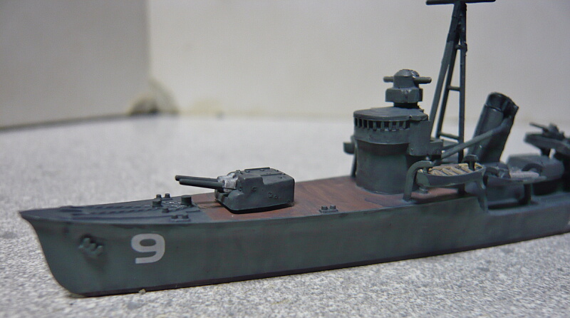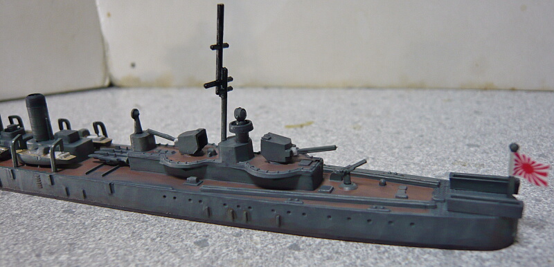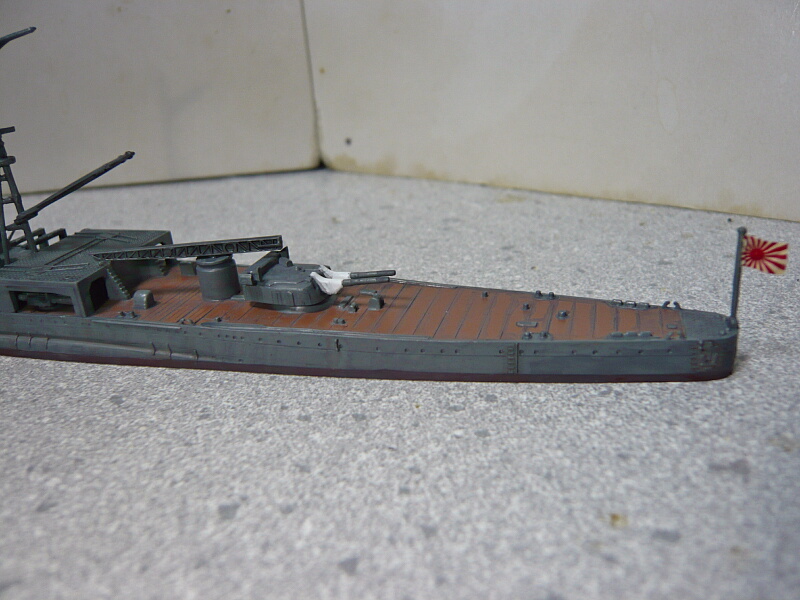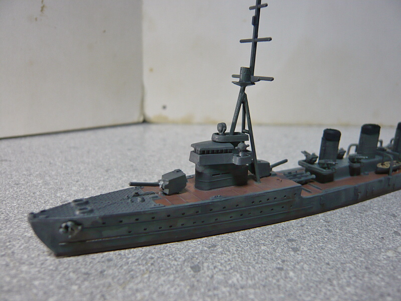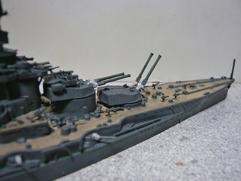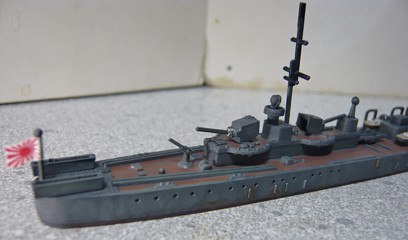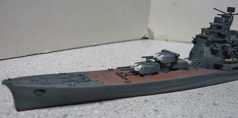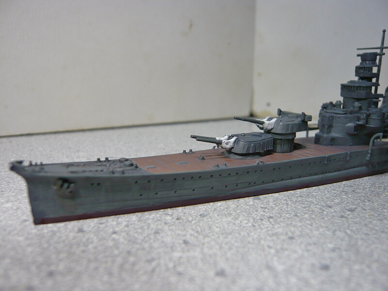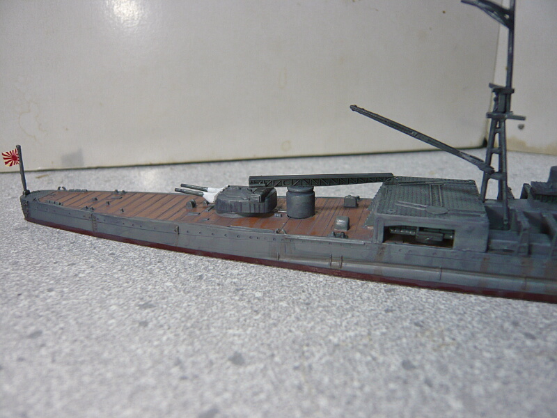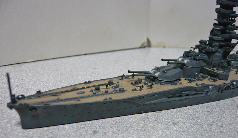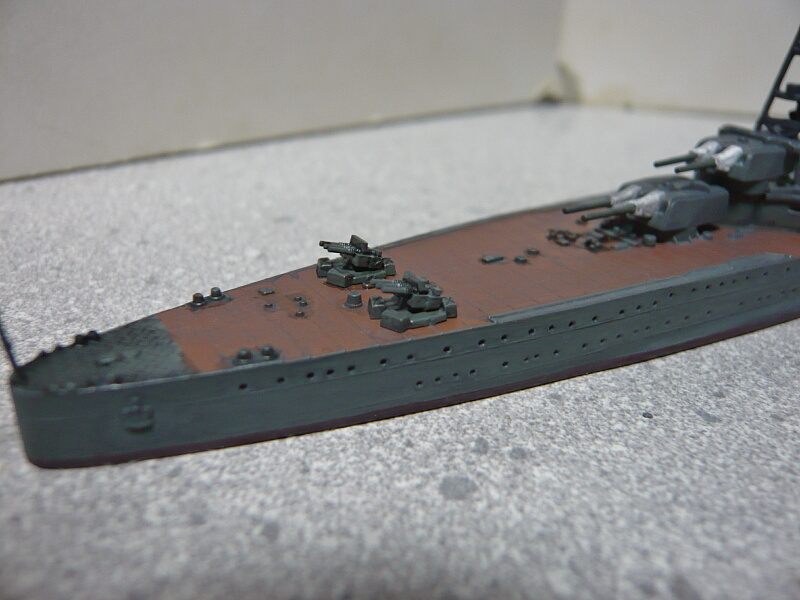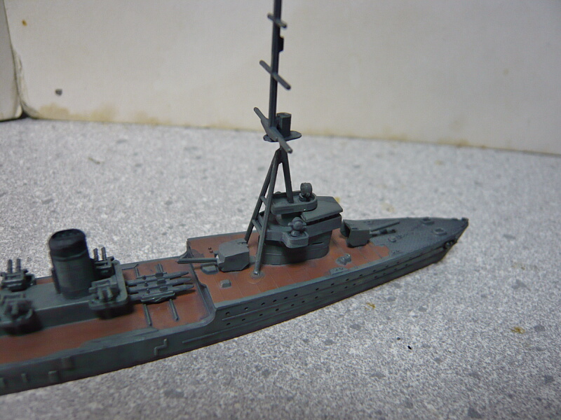 最後にエナメルジャーマングレーでウォッシングしますが、モノが大きいせいかボンヤリしているのでフラットブラックも使ってややクドめに。古い艦なのでフラットブラウンで多少の錆表現もしておきました。完成。