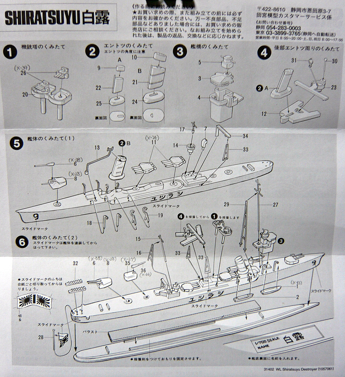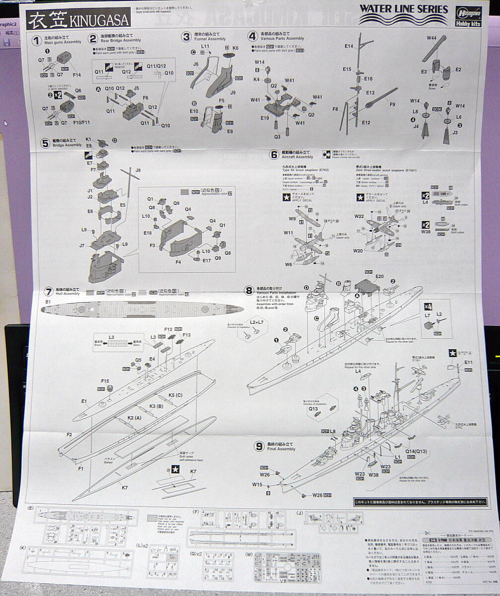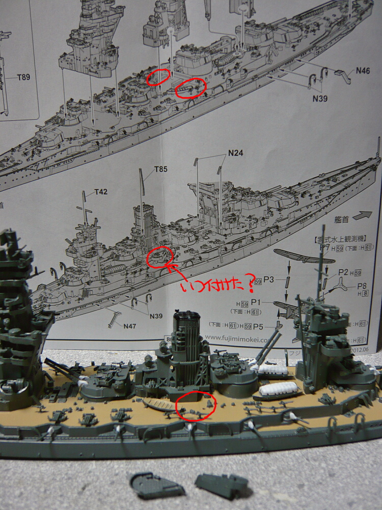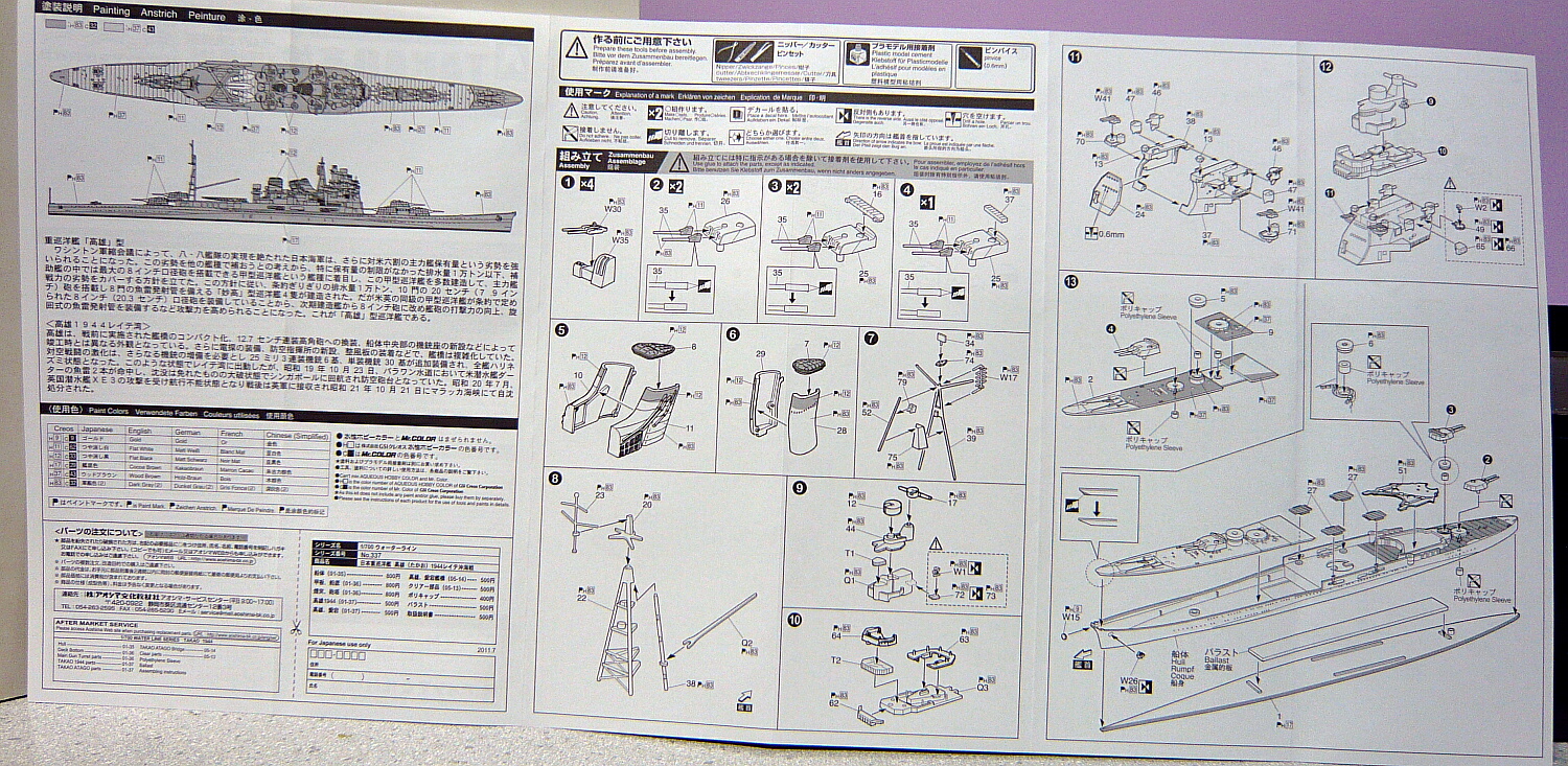 説明書は利根と同様に大きくてページも多いのですが、1か所修正として小さなピラ紙が一枚付いていました。実際は1か所どころじゃなくそこらじゅう間違いだらけの説明書で、もういっそ全部書き直せや!って感じ・・・ハシゴやパイプなど小さくて微妙に寸法の違うものの指示が頻繁に間違っているので取り付け前に仮組みを、というわけにもいかない位置もあって困ったもの。