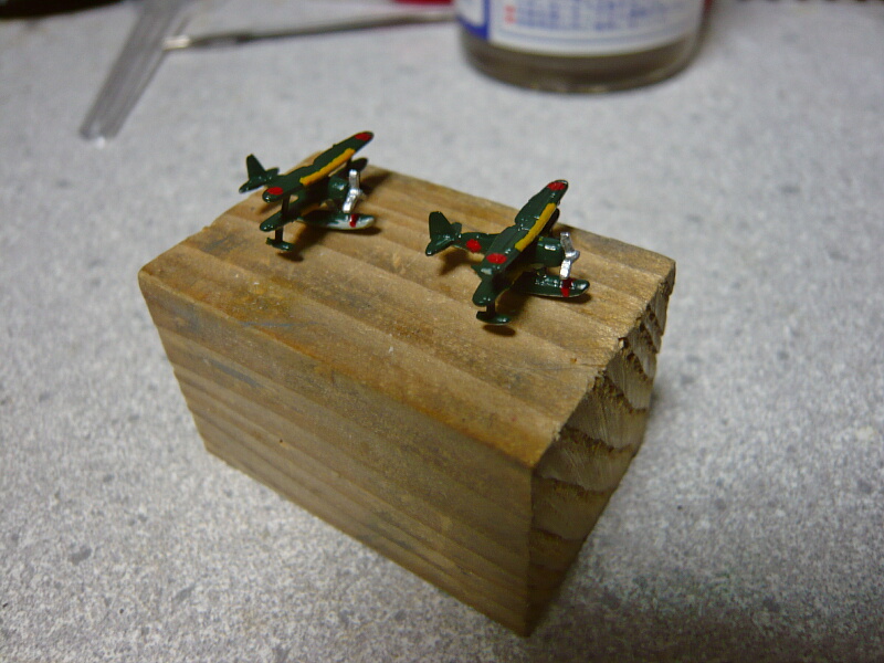 おなじみ零式三座水上偵察機。九四式水上偵察機の後継として十二試三座水上偵察機を経て制式採用され、開戦時には多くの艦艇に搭載されていました。塗色は上面緑・下面明灰白色で共に(三菱系)の塗料指示がされています。が、上の九四式と同じ緑とガルグレーで塗ってしまいます。キャノピーを322フタロシアニンブルー、敵味方識別用の主翼前端内側の黄色は58黄橙色、日の丸とフロート上面の帯は158スーパーイタリアンレッド、機首は33つや消し黒、プロペラ軸は104ガンクローム。あり合わせの色。