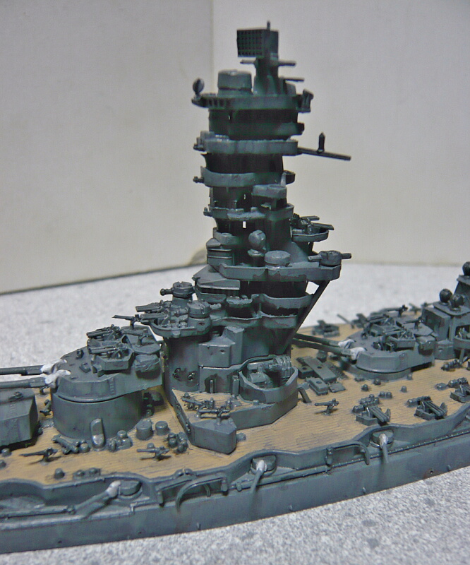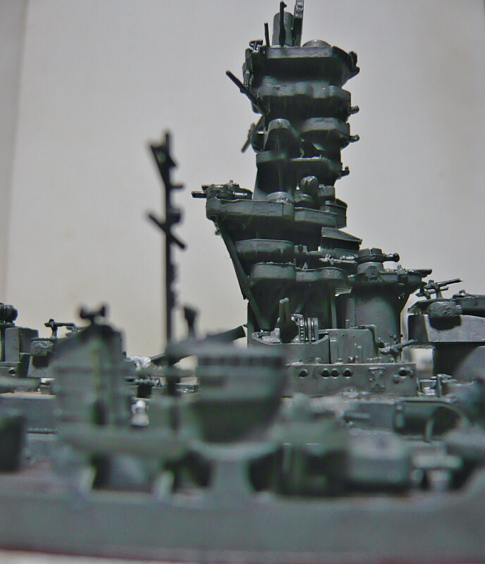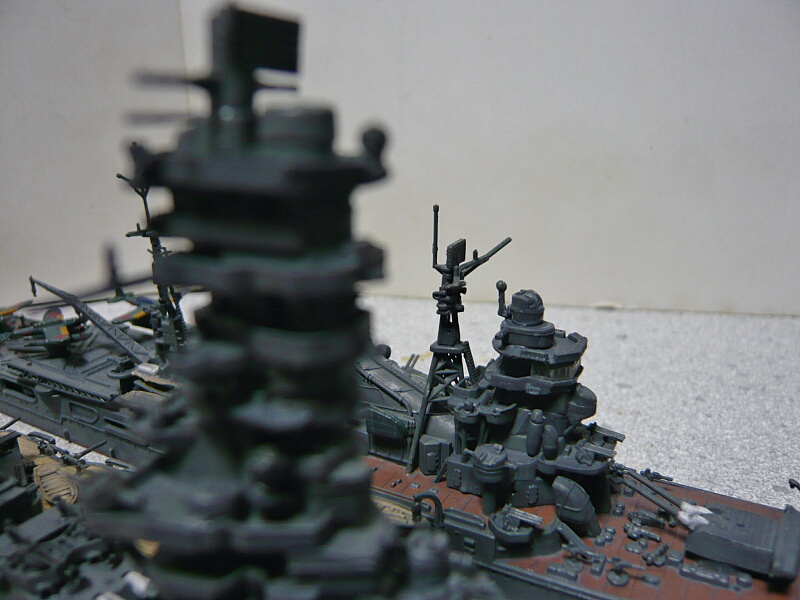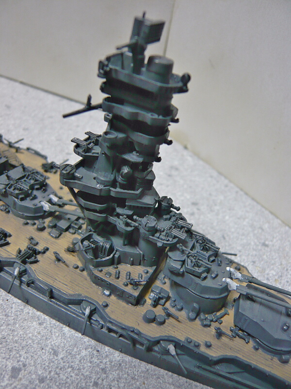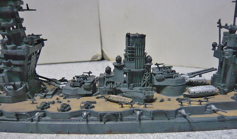 艦橋付近。元々あったマストを軸にして形の揃わないまま積層状に積み上げられた各種指揮所が特徴となっています。2段目の両側面には八九式12.7cm連装高角砲が据え付けられており、艦橋前面の2番砲塔直後に3連装機銃が2基装備されています。