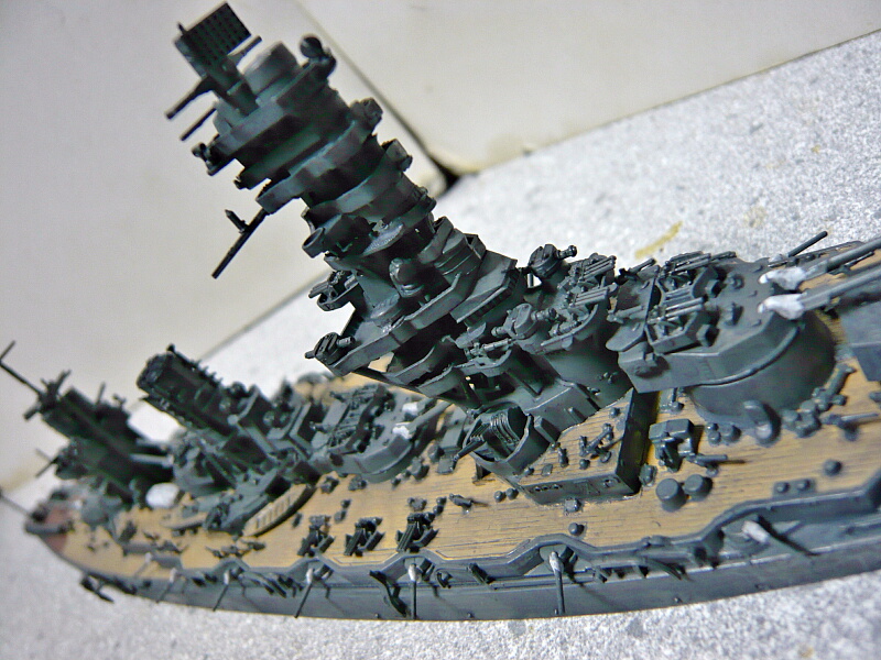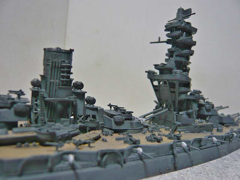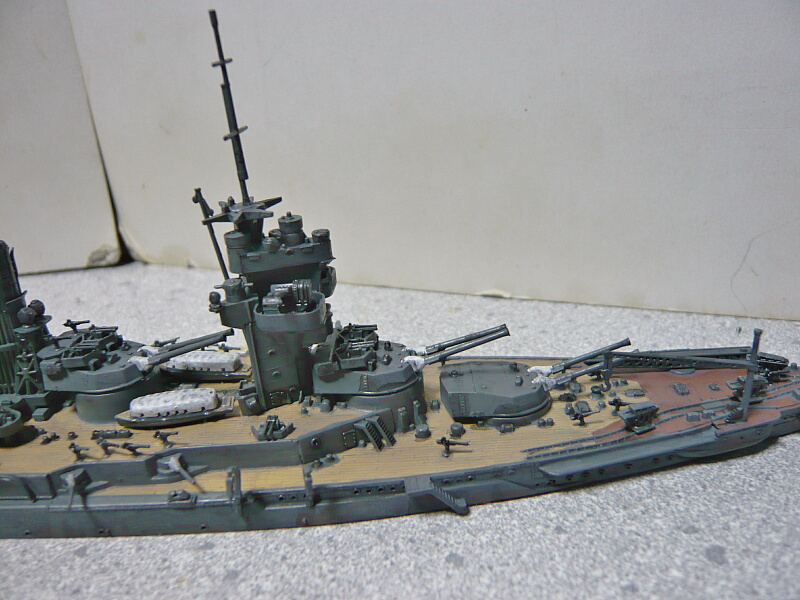 砲塔の取り付けまでが済んだところ。砲塔の上にも機銃が山盛りで当時の必死さが伝わってきます・・・扶桑の3番砲塔の上には航空艤装が載っていた事もありました。船体側面に副砲の砲身が飛び出しているので持ち上げる時にうっかり折らないように注意。