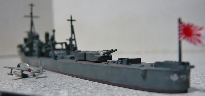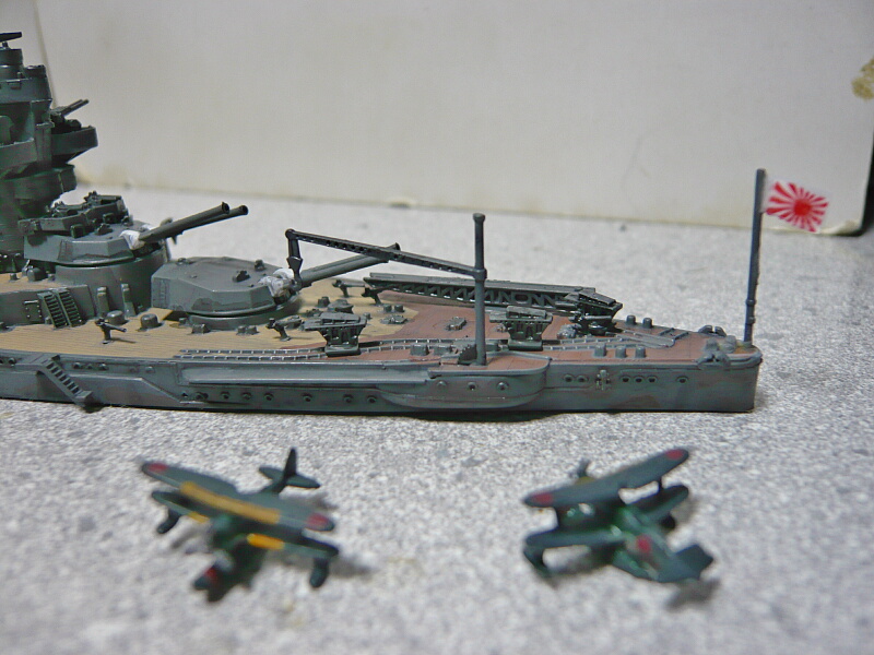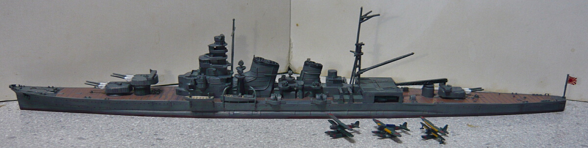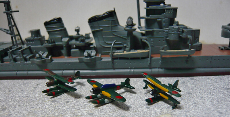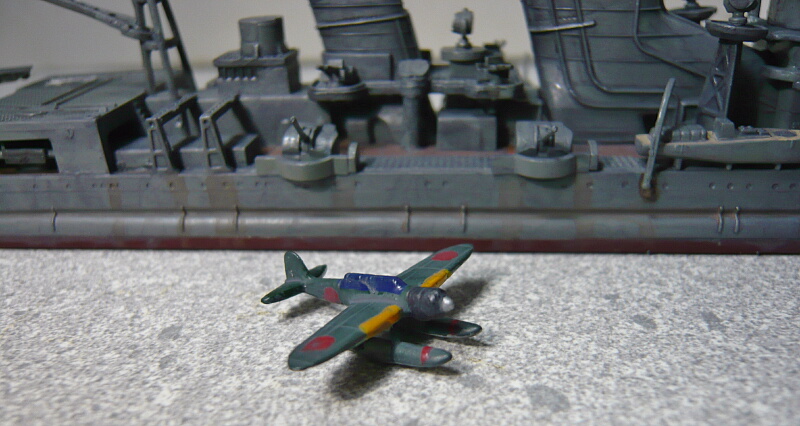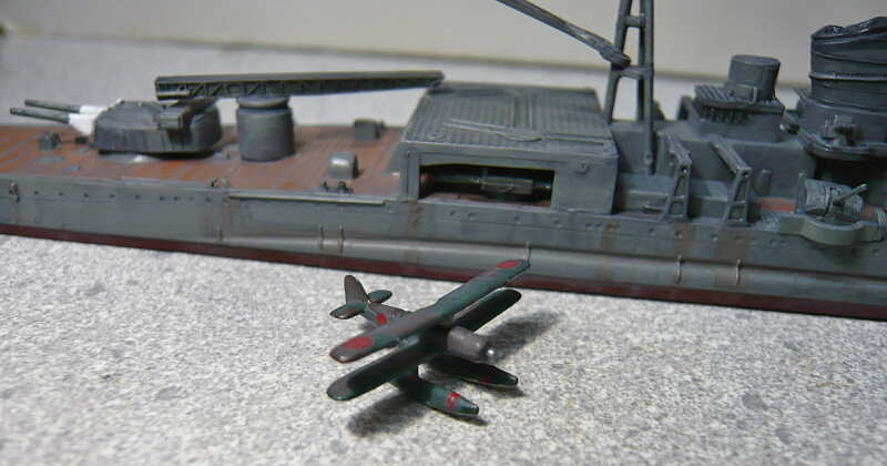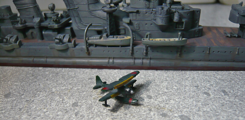 水上機は零式水上観測機が2つ。塗装はイメググって参考にするのが一番ですが、大体説明書通りでOK。細かいですが比較的組みやすいです。ただし組んだはいいけど艦のカタパルトに取り付けるパーツが無く、接着位置の形状もあまり都合よくなかったのでカタパルトには接着しませんでした。