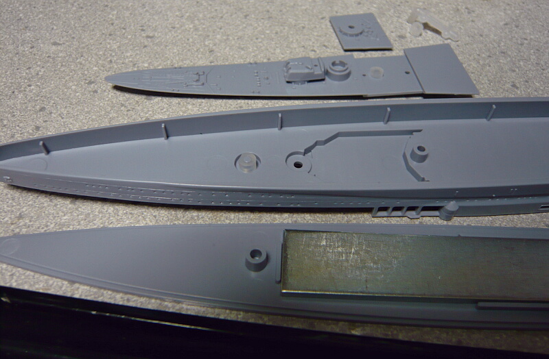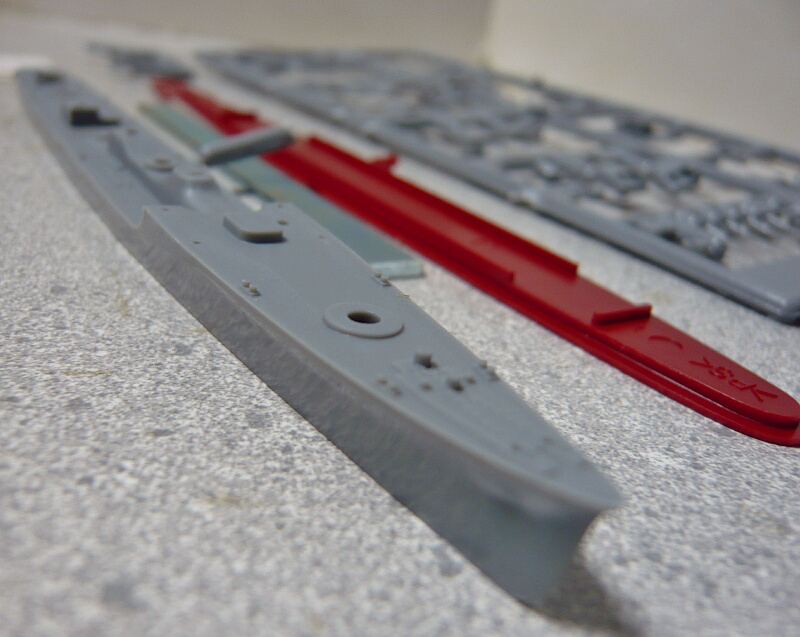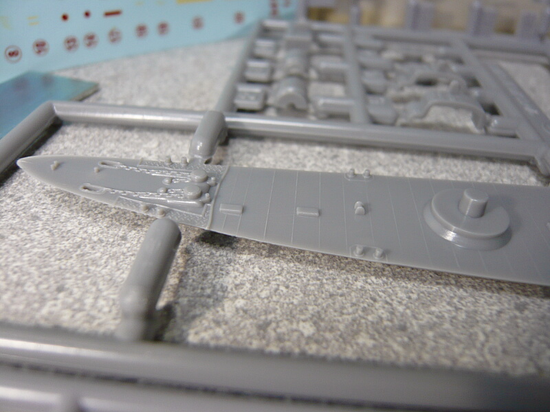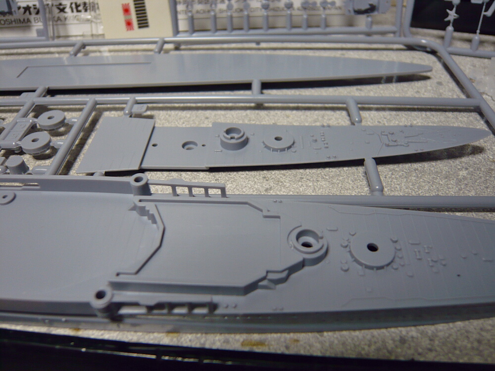 それでは製作開始。船体パーツは甲板にも側面にもモールドがちゃんと入っていて中々のものですが、艦底パーツの外周は船体側面に露出せず下面のフタの役割。甲板前側は別パーツになっています。