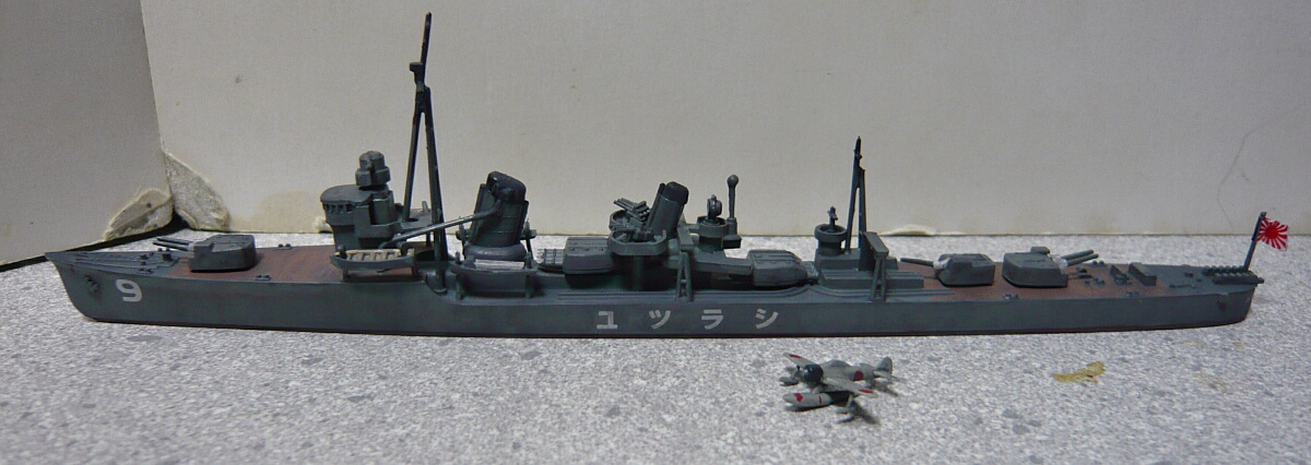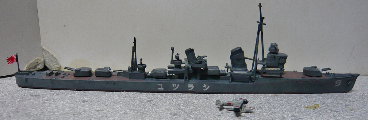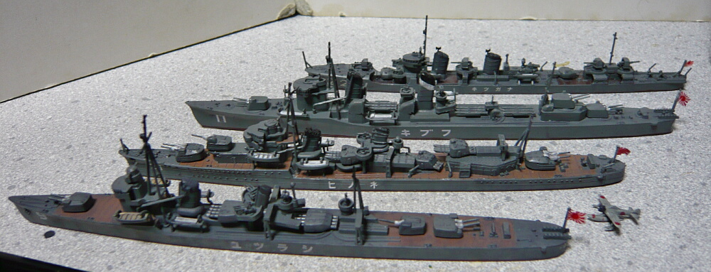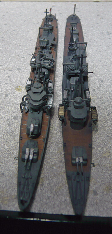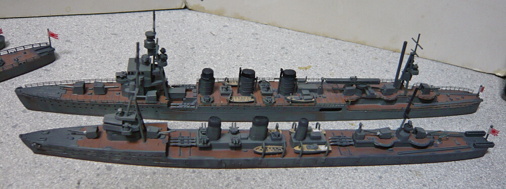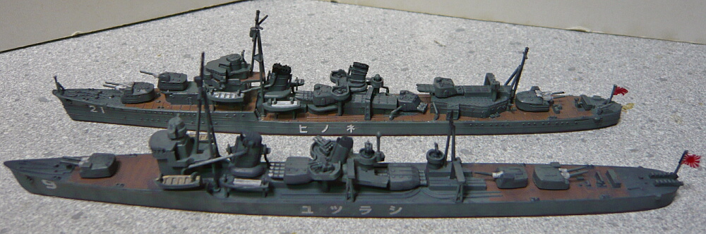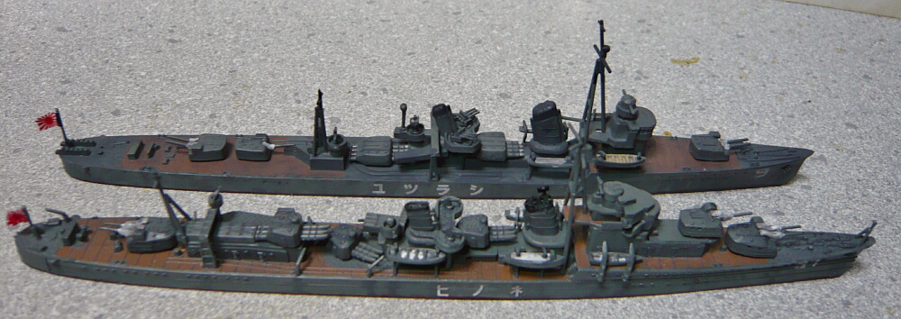 前級である初春型駆逐艦の子日と。全長はほぼ同じですが艤装の配置は結構違いがあります。この子日は新しめのキットなのでディテールが細かく、ちょっと並べるのは酷な印象。