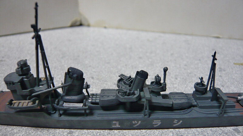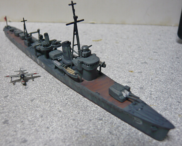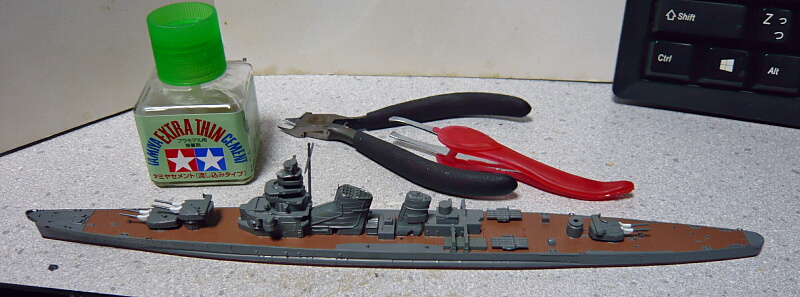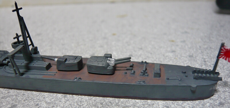 煙突先端や後部マストをつや消し黒で塗ったり、ゲート跡をレタッチして完成間近。駆逐艦キットより簡単なくらい。