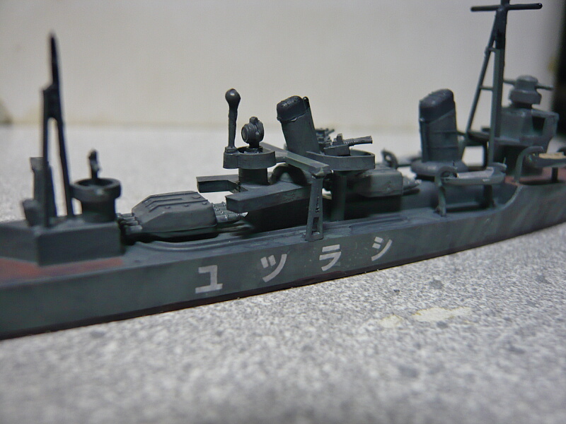 艦尾には爆雷投下軌条があります。再現されていませんが、その前方、連装砲塔との間にある箱状のディテールのあたりにY砲(九四式爆雷投射機)があるようで、ピットロードのキットではそうなっています。まあディテールアップパーツにY砲が付属しているので、つければ良かったんですけどね。