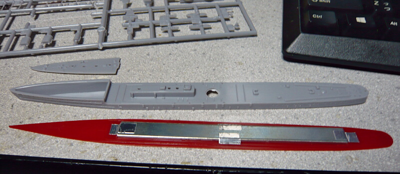 バラストを艦底パーツに置いて船体パーツと貼り合わせます。やや段差が出来がちなのでこだわる人はプラ板などで面一に修正しましょう。