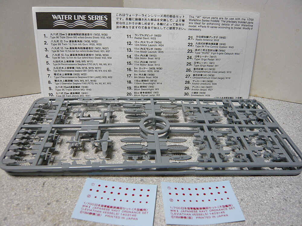 ディテールアップパーツは大型艦用のWパーツが2枚。ですが置き換えて使えそうなのはカッターと内火艇、ラジアルダビッド、25mm連装機銃くらいかも。小舟類はいいのですが連装機銃は下面のダボを切り飛ばして使うと良いでしょう。主要パーツの方のパーツもダメダメってほどではないので今回は使用しませんでした。14cm単装砲塔とかあったら良かったのだけれど・・・