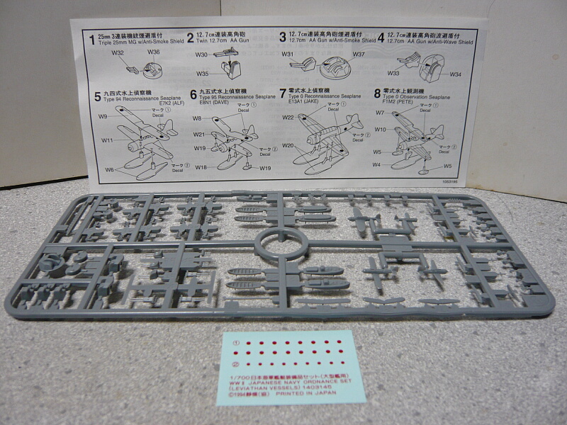 水上機も組みます。説明書では上写真の左、九四式水上偵察機と中、零式三座水上偵察機のみ書かれていますが、右の零式水上観測機も折角なので組んでみました。ディテールアップパーツ内には他に九五式水上偵察機があります。