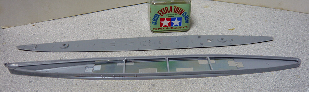 艦舷左右を前端と後端で接着後バラストを貼りつけた艦底に載せ、梁3本を取り付けました。甲板パーツは穴を開け足したりなどの指示は無いのでそのまま載せて接着してしまって良いでしょう。