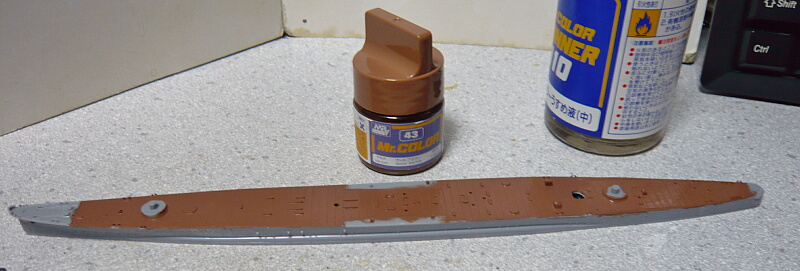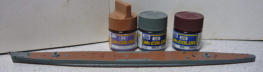 船体の塗装はまずリノリウム色(近似色として43ウッドブラウン)を大まかに塗りました。