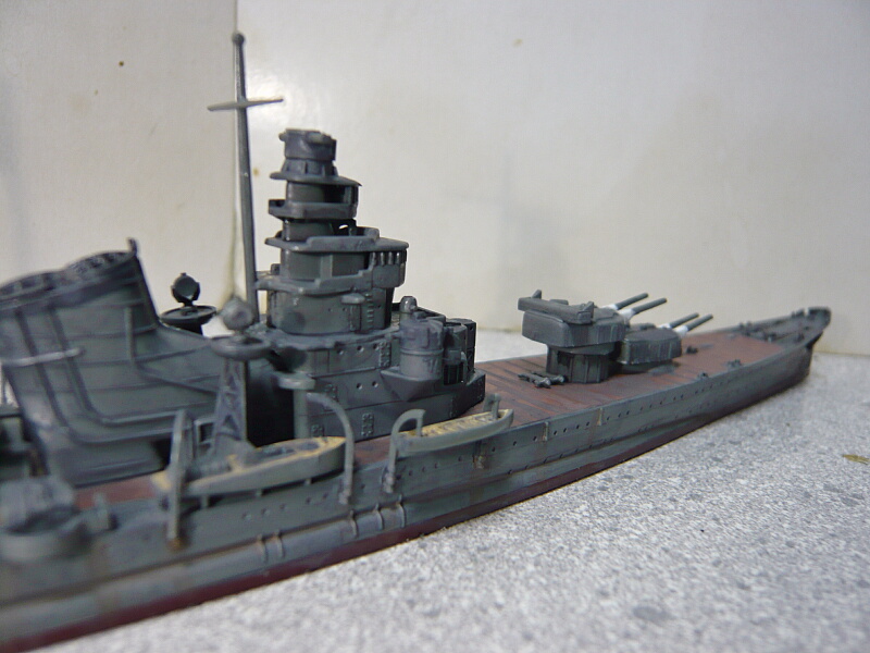 艦首から観察してゆきます。主砲は50口径三年式20cm連装砲。キットは機銃などを見るに近代化改装後なので2号20.3cm砲でしょうか。
