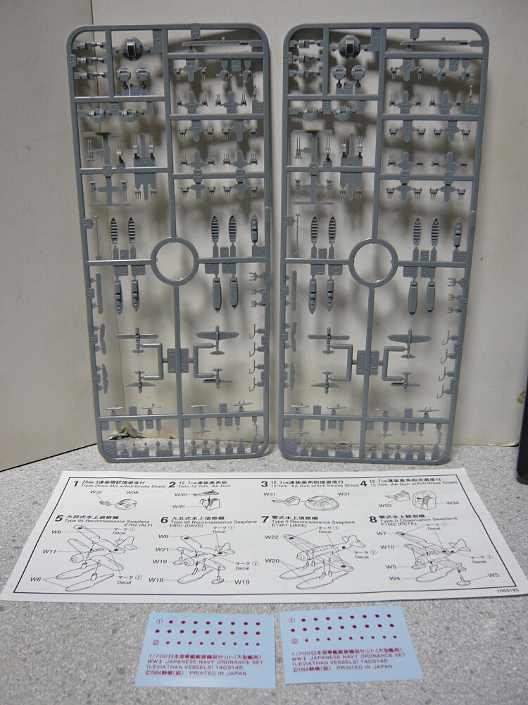 静模のディテールアップパーツ大型艦用が2枚付属。必須パーツを含みます。本体の方の説明書には水上機の組み立て説明や塗装例がありませんが、好みで組む人は塗装についてはググって参考にすると良いでしょう。