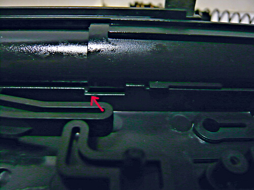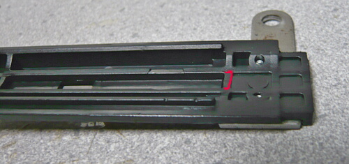 2発発射の原因はノズルの後退量が大きすぎるため、と推測し、ではどうすればノズルの後退量を短くできるか。まず思いついたのがコッキングレバーと剛結されている板の下面にある溝の前端を削ってシリンダーの後退開始を僅かに遅らせる事。上写真の赤く示した分を削ってみました。