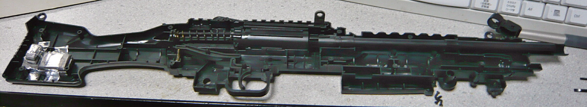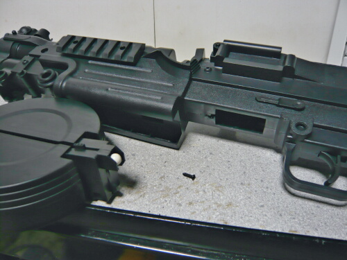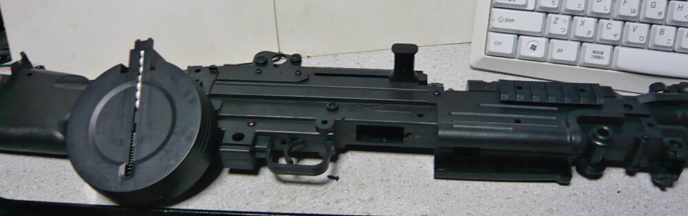 とりあえずモナカ開き。ところでこのブツのバリエーションなのか同じようなサイズのミニミに今度はマガジンが上に付いたものが売られていました。横に付けろよ!といったら右に付けて出してくるんだろうな・・・