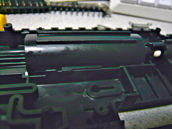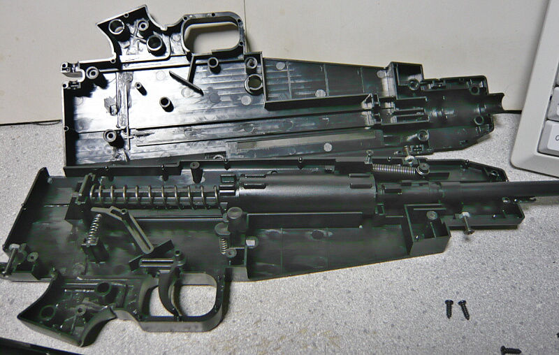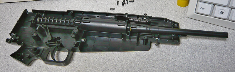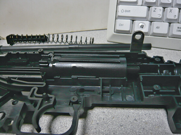 機関部のモナカを開いたところ。一般的な中華チープガンより簡略化された機構を持ち、コッキングレバーがシリンダーに直接取り付く形になっています。そのためコッキング時にはシリンダーがピストンと一緒に機関部の後方まで下がるため、シリンダーの前にあるノズルが抜けた穴とチャンバーが通じてしまい、シリンダーの負圧によってマガジンから上がってきた弾が前方のチャンバーゴムではなく後方のシリンダー側へ吸い寄せられそのまま弾がシリンダー側へ転がり込む事があります。