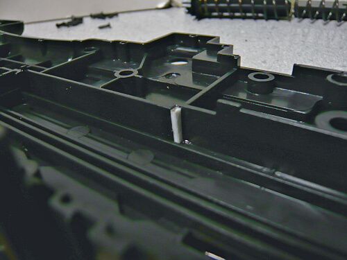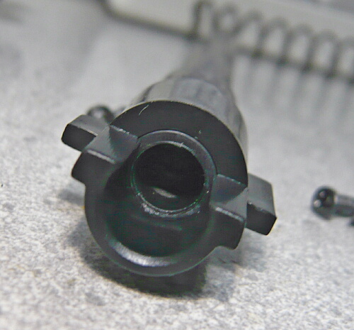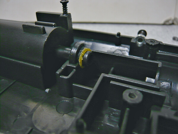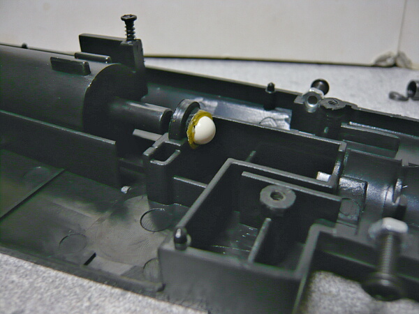 段差の前の面に1.2mmプラ板の細切りを接着。ノズルの後退量が減り、弾1発分ギリギリの量のみ後退するようになったようす。