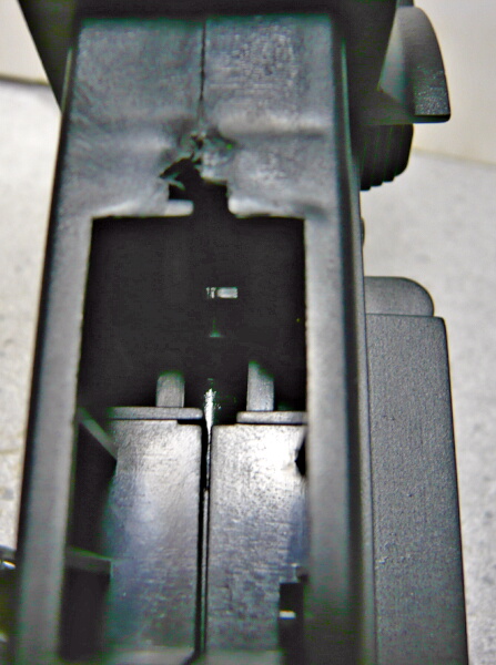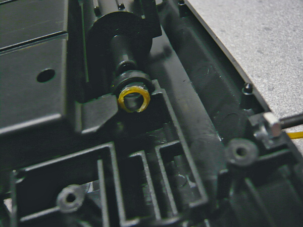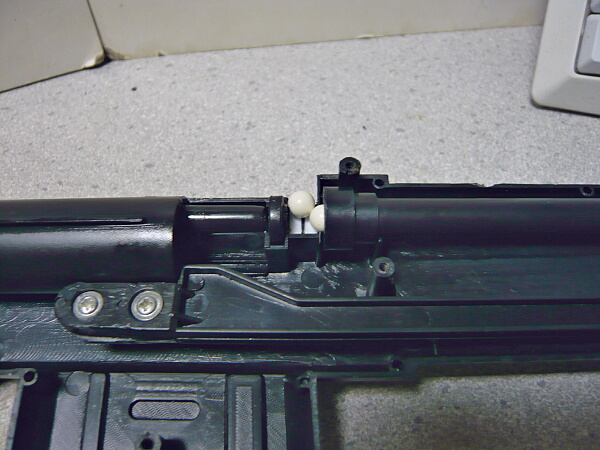 上写真は弾を押し込んだ状態ですが、シリンダーの負圧くらいではこうはならないはず。また仮にこうなっても、ここより後ろ側へ行きさえしなければ、あとは前進したノズルに前方へ押し出されるだけです。