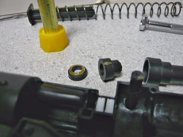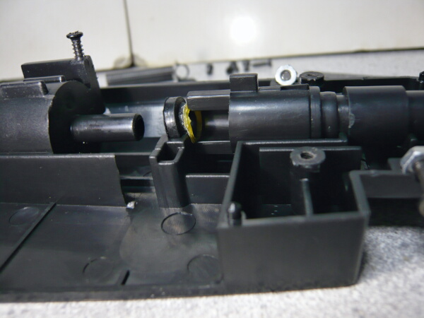 しかし、いざ組んでコッキングレバーを引いてみると、シリンダーの後退量は変わらず、ピストンが削った分後ろへ押されるようになっただけでした。さらに観察すると、シリンダーの後退しきる位置を決めているのは、上写真で赤矢印の示す段差部分だと気づきます。ここにシリンダーの後端がぶつかって止まるようになっているので、ここに何か挟んでやれば後退量を制限できる事になります。