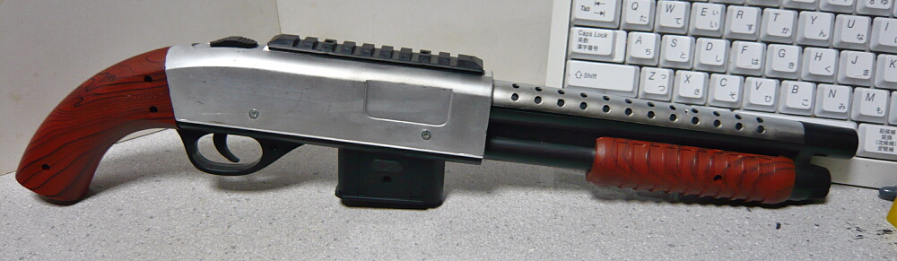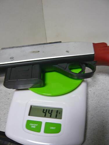 結構ウェイト増量したと思ったのですが、まだまだ軽い441g。ショットガンの場合コッキングが軽く銃本体が重ければ片手でコッキングする、いわゆる「サラコナー撃ち」ができるようになりますが、この銃では中身をウェイトで埋め尽くしたとてそこまでは出来ないかも。