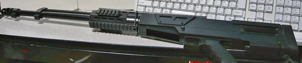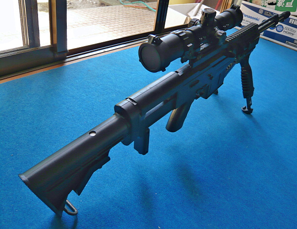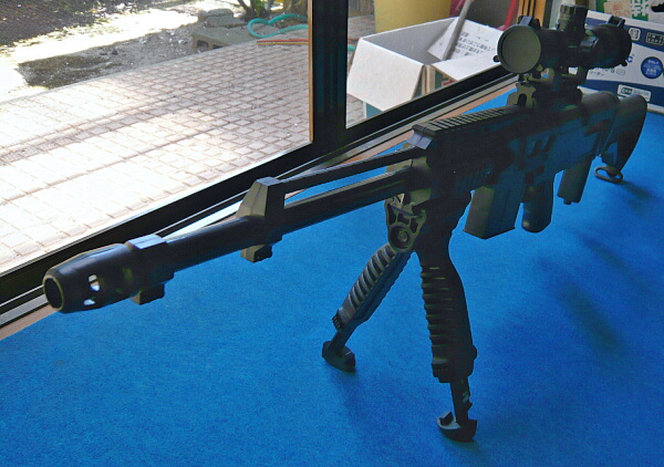 バレットに匹敵する対物ライフルAS50。その大元はイギリスのL96であり、L96の.50口径版アキュラシーインターナショナルAW50のセミオートバージョンがAS50です。このトイガンはそのAS50をスケール1/2ほどに縮小した外装をもつエアーコッキング式の所謂チープガン。値段は2500円くらい。ウチの個体はストックの後ろにストックチューブを増設し、ブッシュマスタータイプの伸縮ストックを取り付けてカービンライフルのようにアレンジしています。