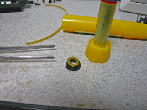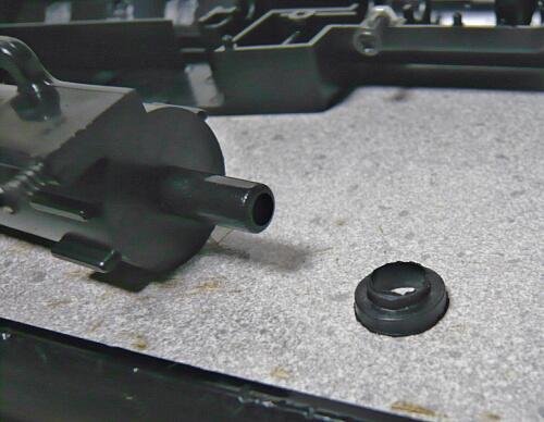 ゴムを配置につけ、ノズルが通るかどうかを確かめます。BB弾が簡単には通り抜けず、それでいてノズルは比較的スムーズに通る事が理想。とはいえ少しノズルの抜き差しがきつくなるのは仕方ありません。