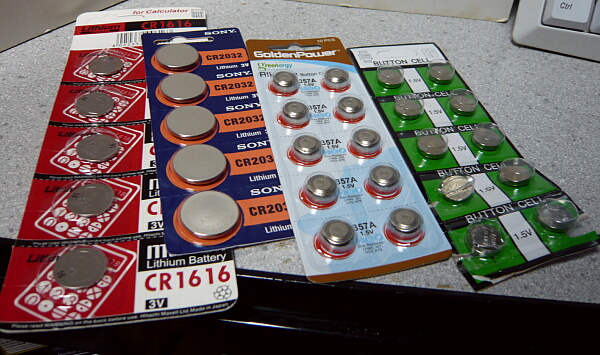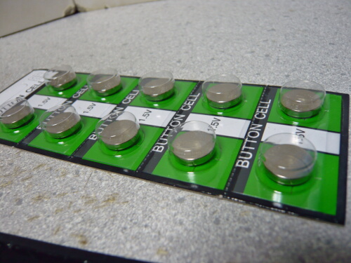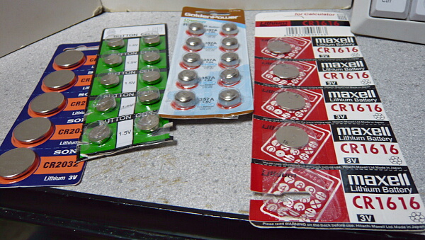 左からCR1616×5(500円)、CR2032×5(390円)、LR44×10(247円)、LR1130×10(390円)。ついでなのでまとめて買ったボタン電池(コイン電池)たち。