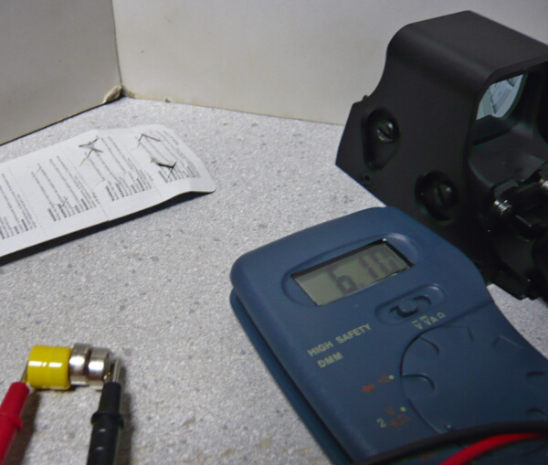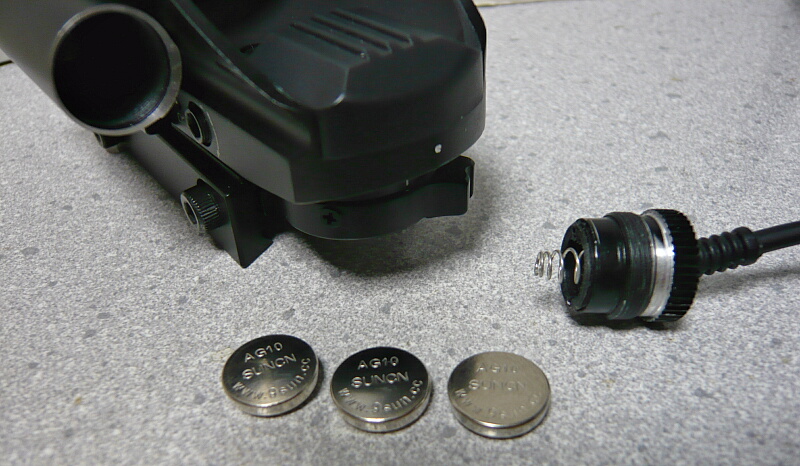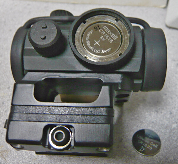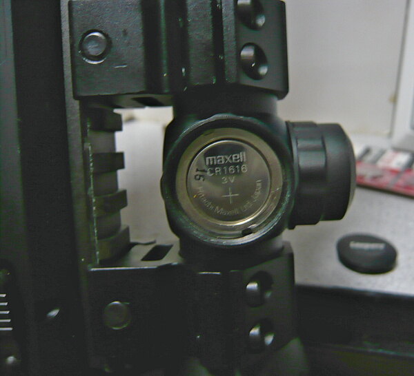 LR44は色々使いようがありますが、ありものの電池で済ましていたものと交換してみましょうか。これはEO551タイプのホロサイトレプリカですが、電池は他のドットサイトにオマケで付いていたものや中華チープガンのオマケのライトなどに入っていたものの寄せ集め。