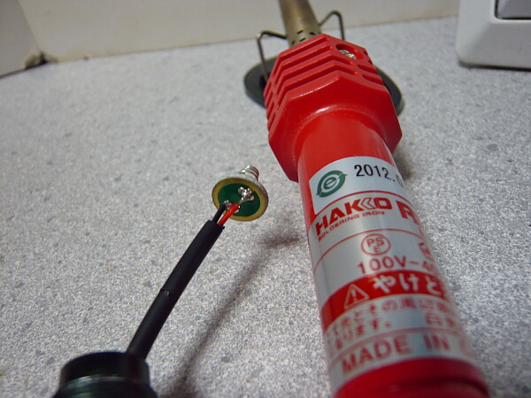 赤い配線の被覆を2mmほど剥き、ハンダの塊に溶着しなおしてやりました。