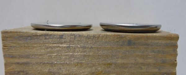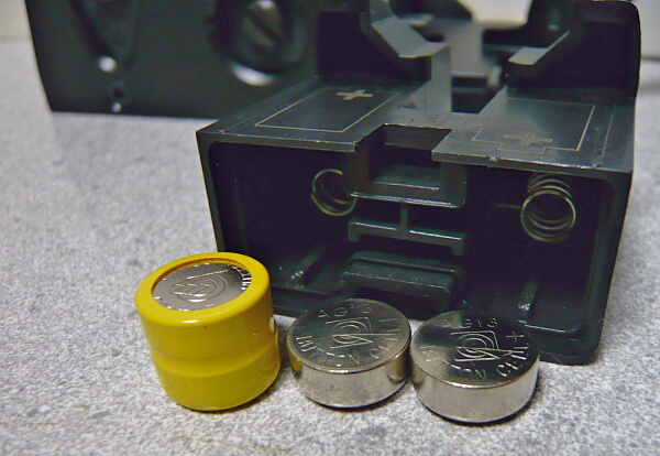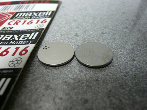 左がCR1616、右がCR1620。16が径(16mm)で16、20が厚さ(1.6mm、2.0mm)という見方をします。機器の方へは1616にピッタリサイズだと1620はフタが締まらない恐れがありますが、1620用なら1616を入れる場合端子を軽く起こしてやればいいだけなのでどちらにも適用できます。もっとも、薄い分容量は少ない事になりますが・・・