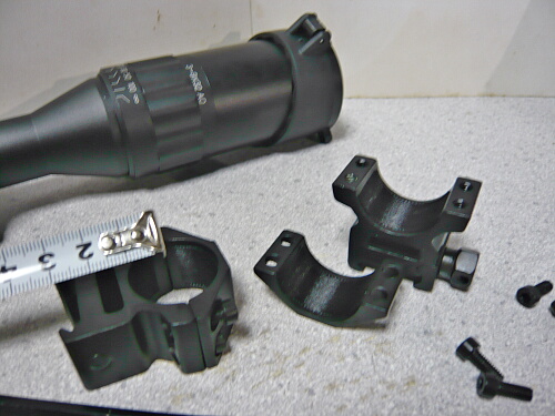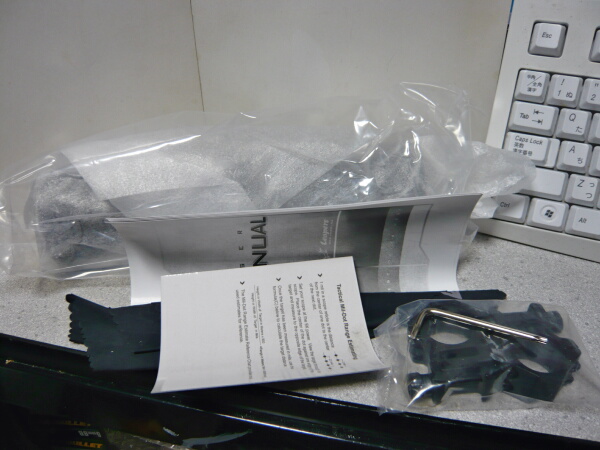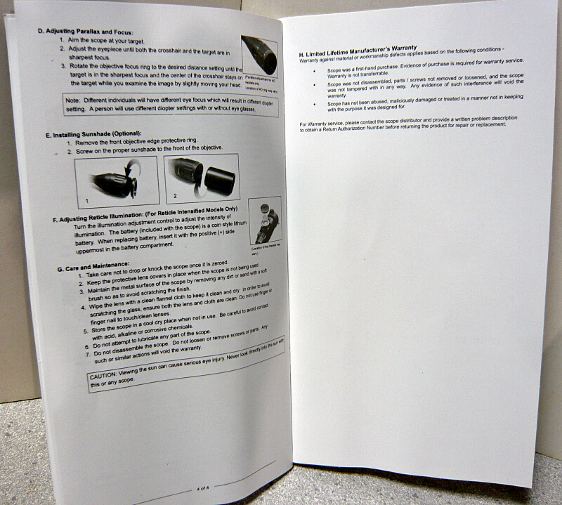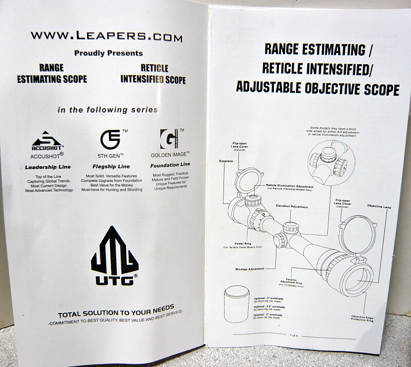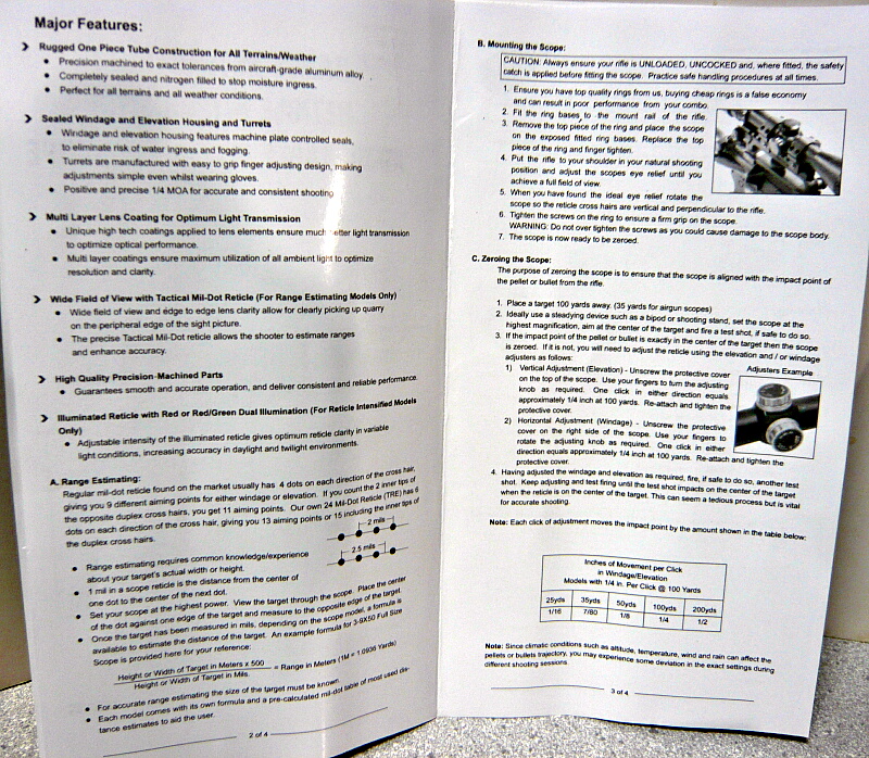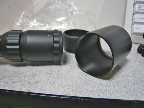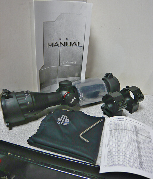 スコープ本体にはバトラーキャップが前後に装着されており、サンシェード(接眼レンズ側にかぶせられているビニールで覆われた筒)もあります。その他にはチューブ径1インチタイプのマウントリング2個、トルクスタイプのLレンチ、レンズ拭き、説明書と、あと何か表が書かれた厚紙。厚紙にはTactical Mil-Dot Range Estimate Reference Chart(C)とあり、あまりこの方面は詳しくないのでサッパリ。