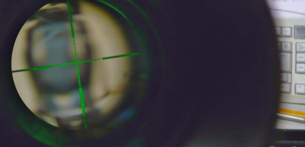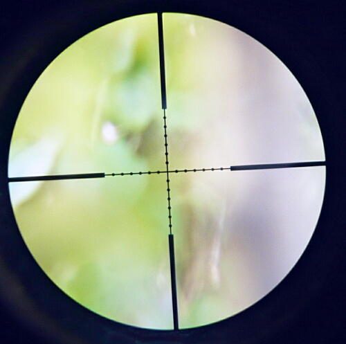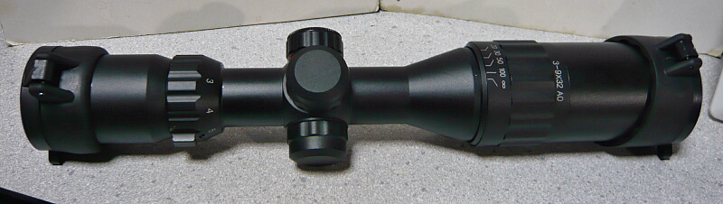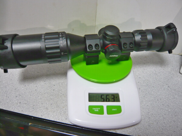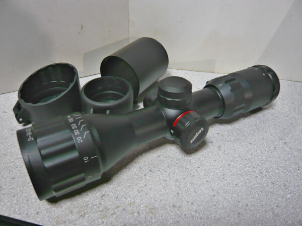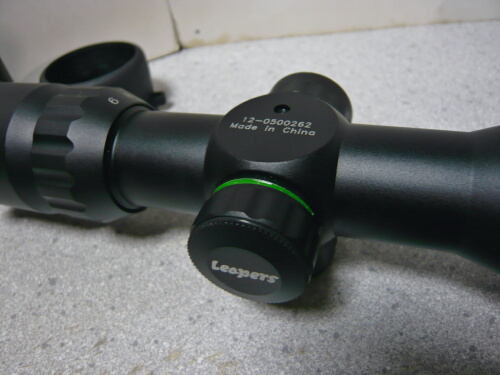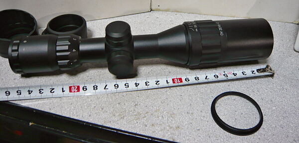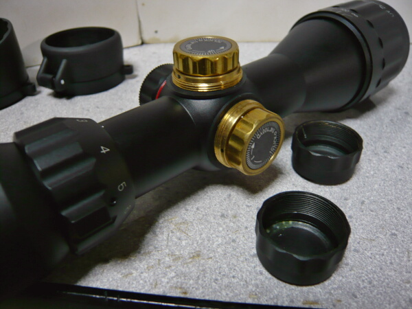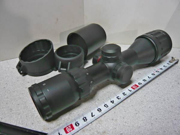 本体全景。赤と緑に光るイルミネーション機能があるのでそのダイヤルが本体中央の左にあり、その上と右のダイヤルはレティクルの上下左右調整。接眼レンズ側には倍率調整の目盛りが振ってあり、ねじり回して調整。接眼レンズ側の端の+0-という表示、対物レンズ側の調整は、えーと、よくわかりません・・・素人なので勘弁して下さい。