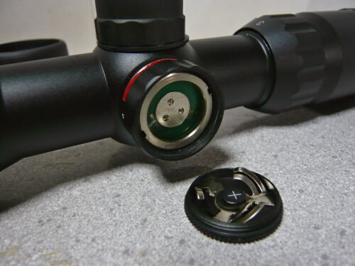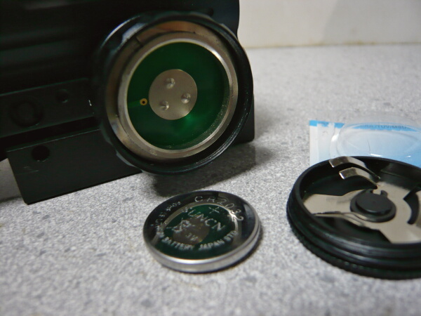ダイヤルのプレートを回して外すと中に電池を入れるスペースがあります。付属のCR2032電池を入れます。レーザーサイトの電池はすでに入っており、箱出しでスイッチをつまめば光りました。説明書には書いてありませんが、ググって同じ品物の仕様を調べるとAG10(LR1130)電池が3個、筒の中に入っているようです。