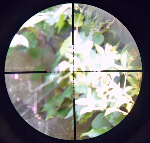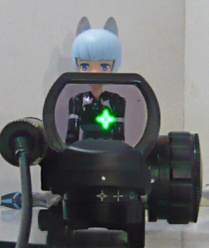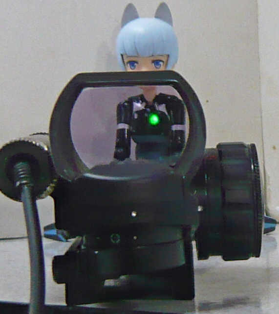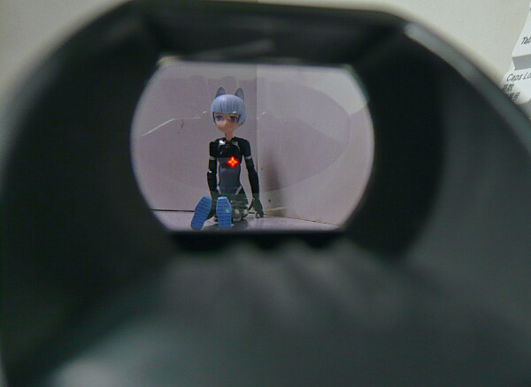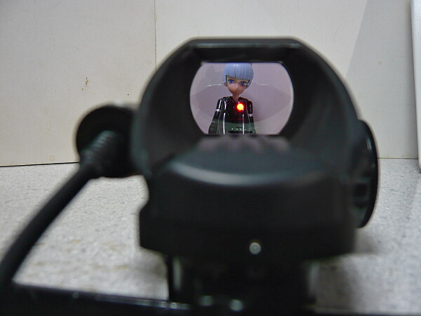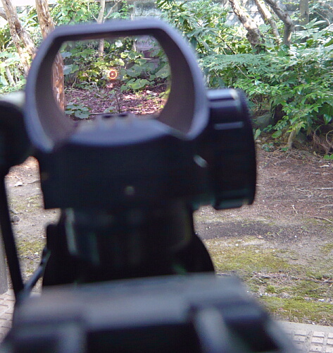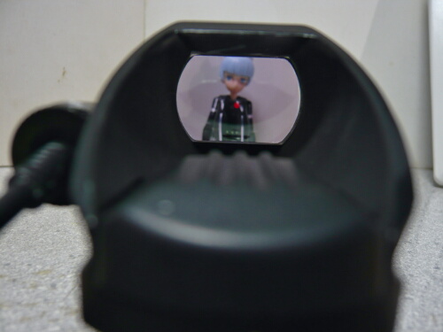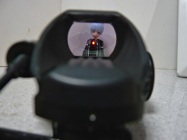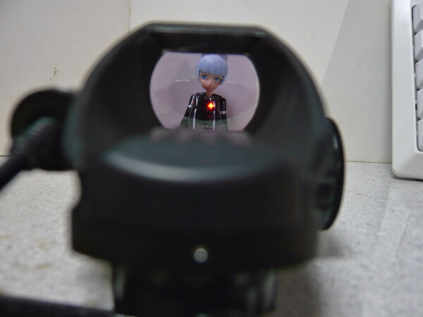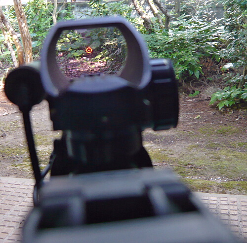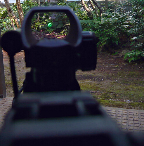ドットサイトの側のレンズは赤/緑ドットの製品のお約束で紫っぽいコーティング。若干手前のボディが映りこみますが、見づらいというほどではありません。ドットの発光は赤・緑各5段階。ドットの形状も4種類からセレクトできます。上写真は赤の輝度1、ドットは一般的な小さい点のタイプ。