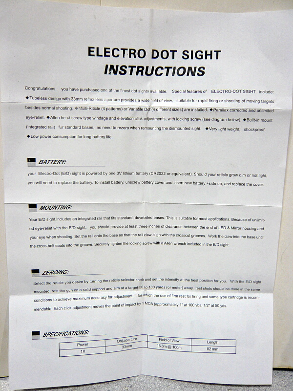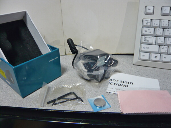 安い割には色々入っています。ドットサイト+レーザー本体、レンズ拭き、Lレンチ3種、説明書、CR2032電池1個。