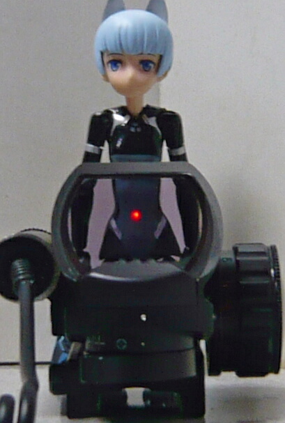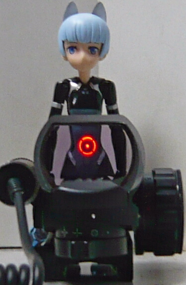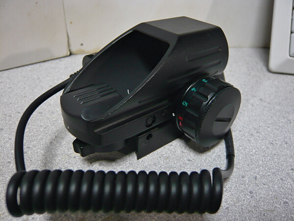 本体はリフレックスサイトと呼ばれるタイプ。ホロサイトを前後逆にしたような形ですが、レンズは前側にしかありません。よくある3500円くらいのオープンドットサイトのレンズの後ろが覆われていてダイヤルを右横に移設したようなものです。ただし覆いがある分、半チューブタイプという感じなのでレンズは見やすく、オープンタイプとチューブタイプの中間的な見晴らし。本体左側面にはレーザーサイトが取り付いており、その後ろからはカールコードの付いたスイッチが伸びています。
