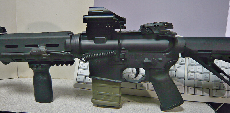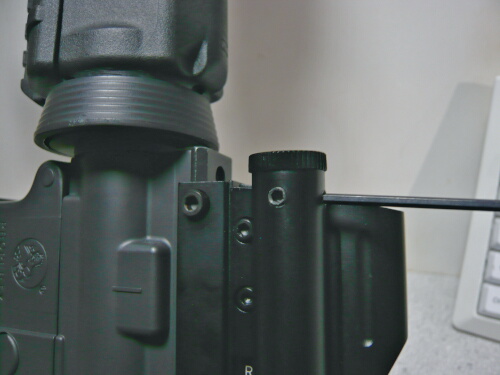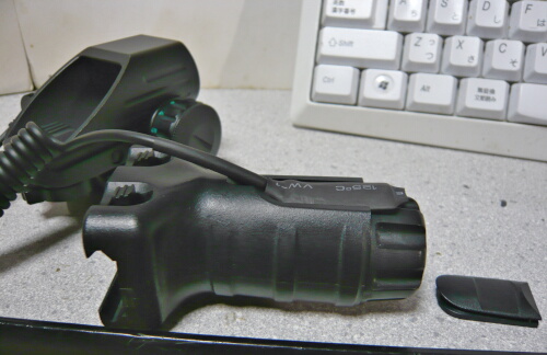 レーザーのスイッチはこのようにフォアグリップなどの専用スロットに納める事ができます。が、別にどこにつけてもOK。使いやすい場所に好き好きに取り付けましょう。