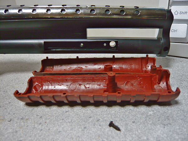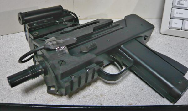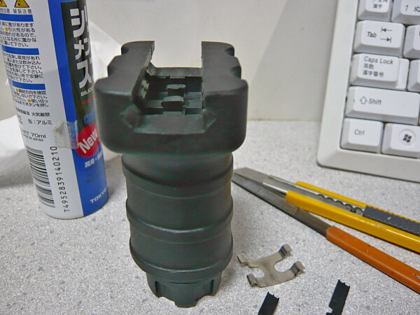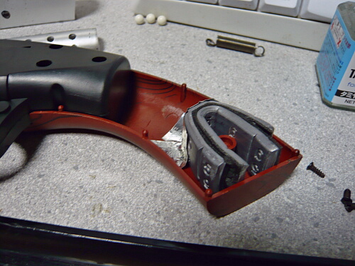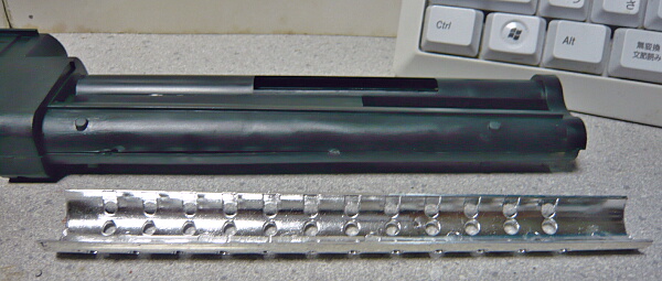 銃口パーツは接着されていたのを引っぺがしたのでただ差し込むだけだとユルユルです。ハメコミで接する部分をアルミテープで太らせてタイトにしてやります。レイルは上に反っていたので手で曲げてみたら折れました・・・ABS接着剤で補修し、反った分はライターで炙って曲げておきます。
