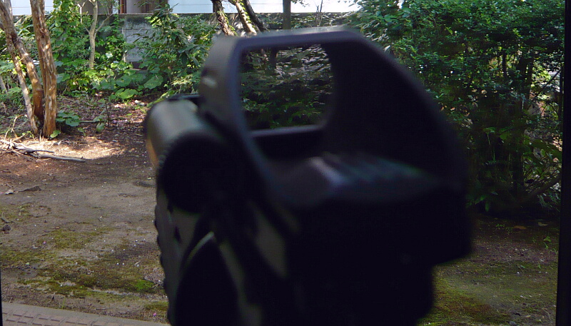 レーザーON!光点どこ?実際は銃口の動きに連動して光点がフラフラ動くので見つけるのは難しく無いのですが、日差しが強く対象までが遠いと役に立たない傾向にあります。交戦距離が近く暗めのシチュエーションとなる室内戦に向いているでしょう。ただし小さくても強い光を発するためこちらの位置も相手に知られやすい、という点も考慮に入れる必要があります。