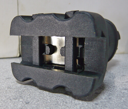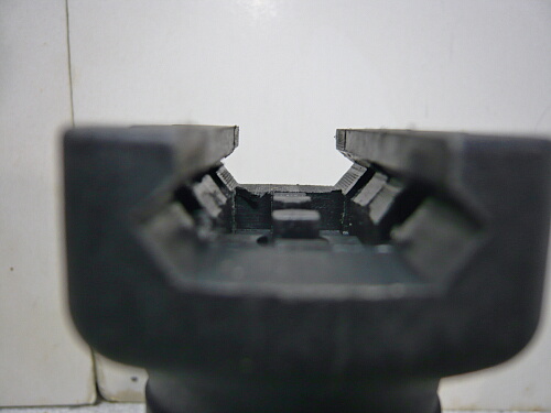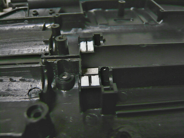 棒ヤスリで中央の2つの突起を中心にレイル面を削りますが、バリもそこそこあるのでそれも処理。一旦差し込んだら付けっぱなし、という用途にしてもハンマーでカチ込まないと入らない固さだと抜く時の苦労が想像されてしまうし、なにしろ左右にある4つのスイッチを押し下げながらやらなければならないので、差込みくらいは軽くないとマトモに使えません。