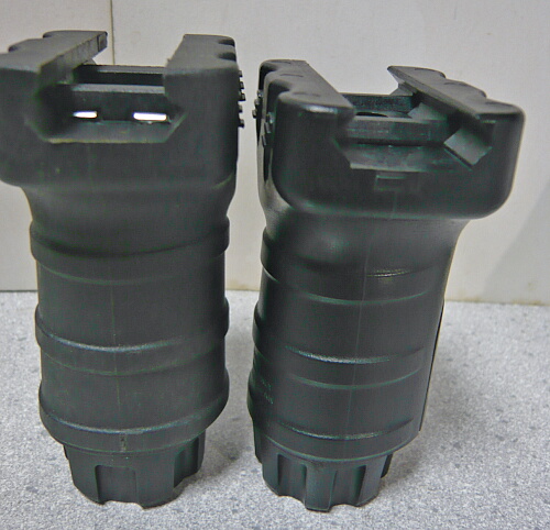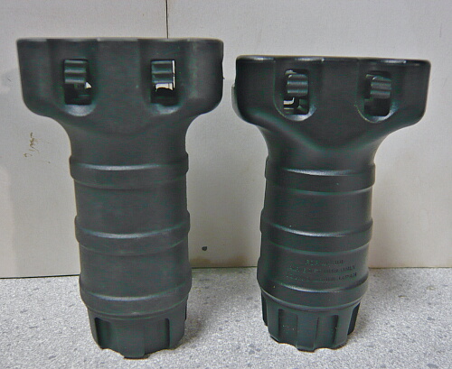 マルイのショートフォアグリップ(右)と。若干のサイズ差はありますが大まかな形状は同じ。マルイの方が色が黒くてやや光沢があり、今回のものはつや消しが強く材質は中華レプリカによくみられるデュポンポリマーっぽいもの。グリップ部分の断面形状はどちらもただの円柱ではなく卵型をしており、今回のものはスイッチを入れるスロットが無いので左右が分かりにくいですがその分好みでどちらに向けても良い事になります。