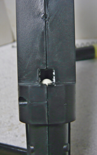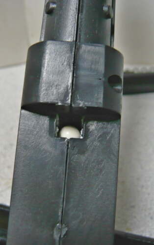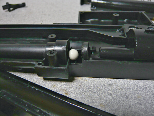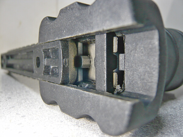 シリンダーが前進した状態。コッキング時にシリンダーごと一番後ろまで後退する機構で心配なのはチャンバーに入った弾がバレル方向ではなくシリンダー側へ転がり込む事。以前買ったAS50がこの点について何の対策もしてないのでボロクソに言いましたが、この銃ではシリンダーのノズルを通す部分にゴムパッキンがあり、シリンダー側へ弾が転がるのを抑止しています。