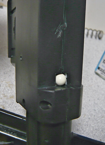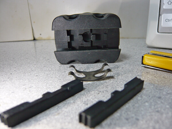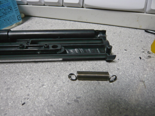大体削れたらシリコンオイルを染み込ませたティッシュでレイルと当たる面を拭いて滑りをよくしてやります。組みなおす時は板バネを置いてから、バネを上から押さえつつ横の穴から棒を差し込みます。スプリングテンションが強いと感じるなら板バネを軽く曲げてテンションを調整してやります。