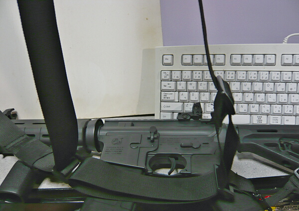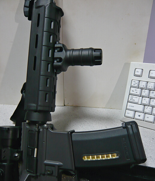 とりあえず暫定的にフォアグリップの付け根より上の位置にセロテープで貼ってみました。銃というやつは基本的に油っこいのでセロテープは貼りにくいです。もっとマシなテープを使いましょう。