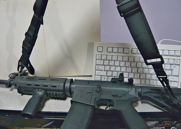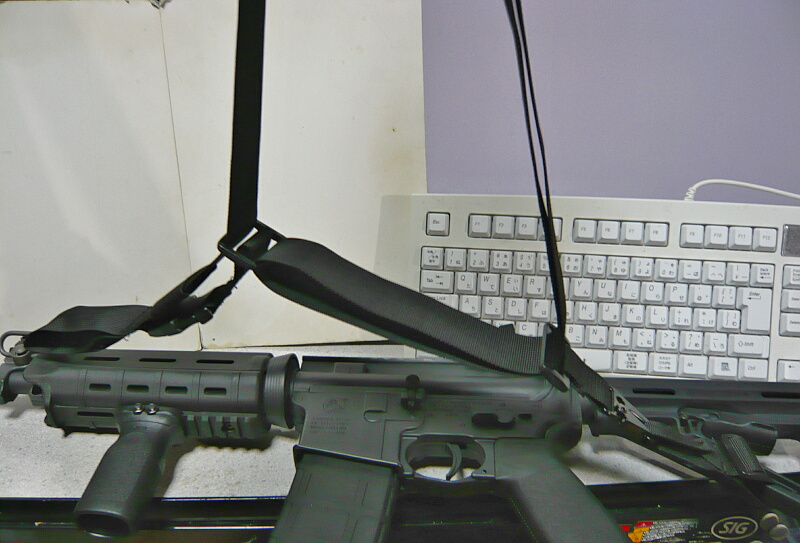 まだスリングをつけていない銃は、という事でトイスターM4A1。といってもスイベルが付いてないのでどうしよう、と思ったらストック側に掛ける側のナスカンの先に小さいスリングが付いています。MP7A1やG36には何かしら介する必要がありますが、ナスカンじゃなくスリングを直接かけるスイベルがあれば大概装着できるはず。ストックチューブの後端の位置に巻くような装着方(XM177などの旧型テレスコタイプなど)はちょっと短くてダメかも?