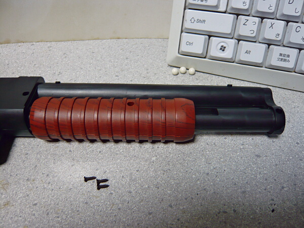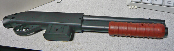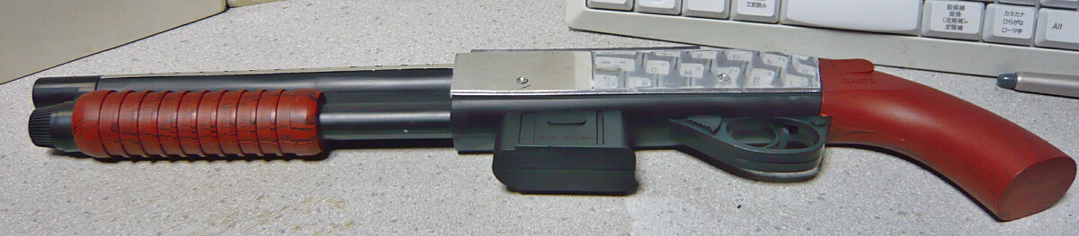 コッキングをするとこの位置で止まります。ここから前へ前進させてからトリガーを引いて発射。引いた状態でトリガーを引くのは厳禁。一見やってしまいそうな操作ですが、ポンプアクションの動作は大体引いて戻すまでが1アクションであり、戻しきった時点でやっと「かっこいいだろう!(ギャキィ」となる動作なので、実際やってみると自動で前進しなくてもあまり違和感はありません。