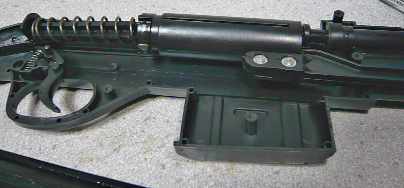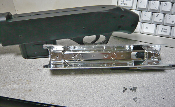 レシーバー部分のメッキパーツは左右計4本のネジを抜くと上へ外せます。ネジは頭が潰れ気味なので丁寧に。メッキパーツの裏側、レシーバーの上は自由落下式のマガジンスペースになっていて、前端にチャンバーへの穴があります。