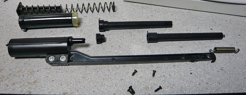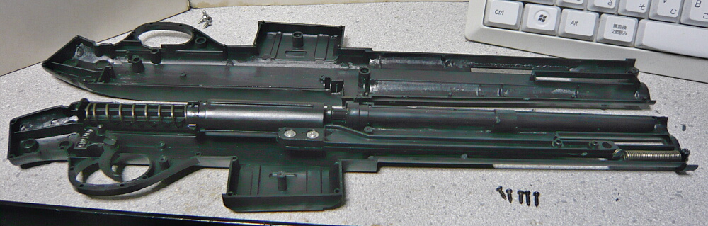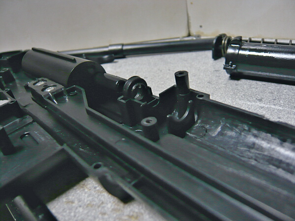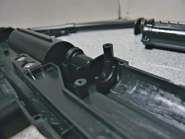 発射に関わる基幹パーツ。コッキングピースと連結される棒がシリンダーに直接取り付いており、コッキングピースを引くとシリンダーごとピストンとスプリングを後ろまで押す形式です。バレルはプラ製の2ピース。手モギしたようなゲート跡が銃全体のパーツほぼ全部にあり、これは丁寧に削ってやりたいところ。