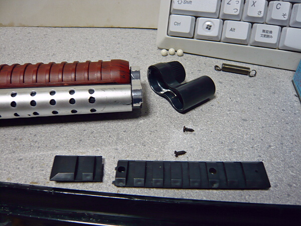 このスプリングはコッキングピースを引いたあと前進させるためのスプリングですが、ショットガンのコッキングピースはそもそも引いた後は自分で前進させるもの。またコッキングを重くしている原因パーツであり、前側が固定される部分も華奢ですぐ折れそうなので今回はこのスプリングは入れずに組んでみます。